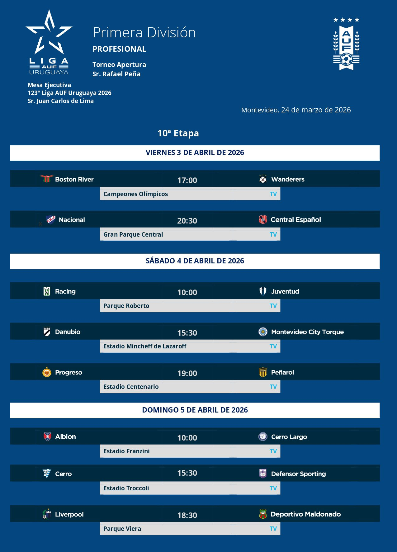Mañana sábado Racing vs. Juventud juegan a las 10:00 en el Parque Roberto. A las 15:30 en el Estadio Mincheff de Lazaroff, Danubio recibe a Montevideo City Torque. Cierra la actividad de sábado Progreso vs. Peñarol a las 19:00 en el Estadio Centenario.