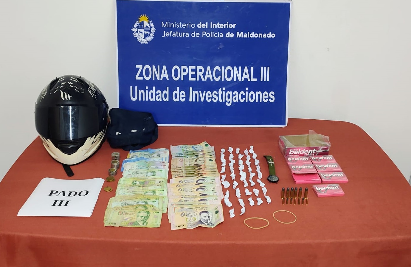Se trata de un joven de 21 años que ya tenía antecedentes por actividades similares, intervenido en el barrio Asturias de la ciudad de San Carlos, con cocaína, dinero y un arma de fuego así como decenas de proyectiles.