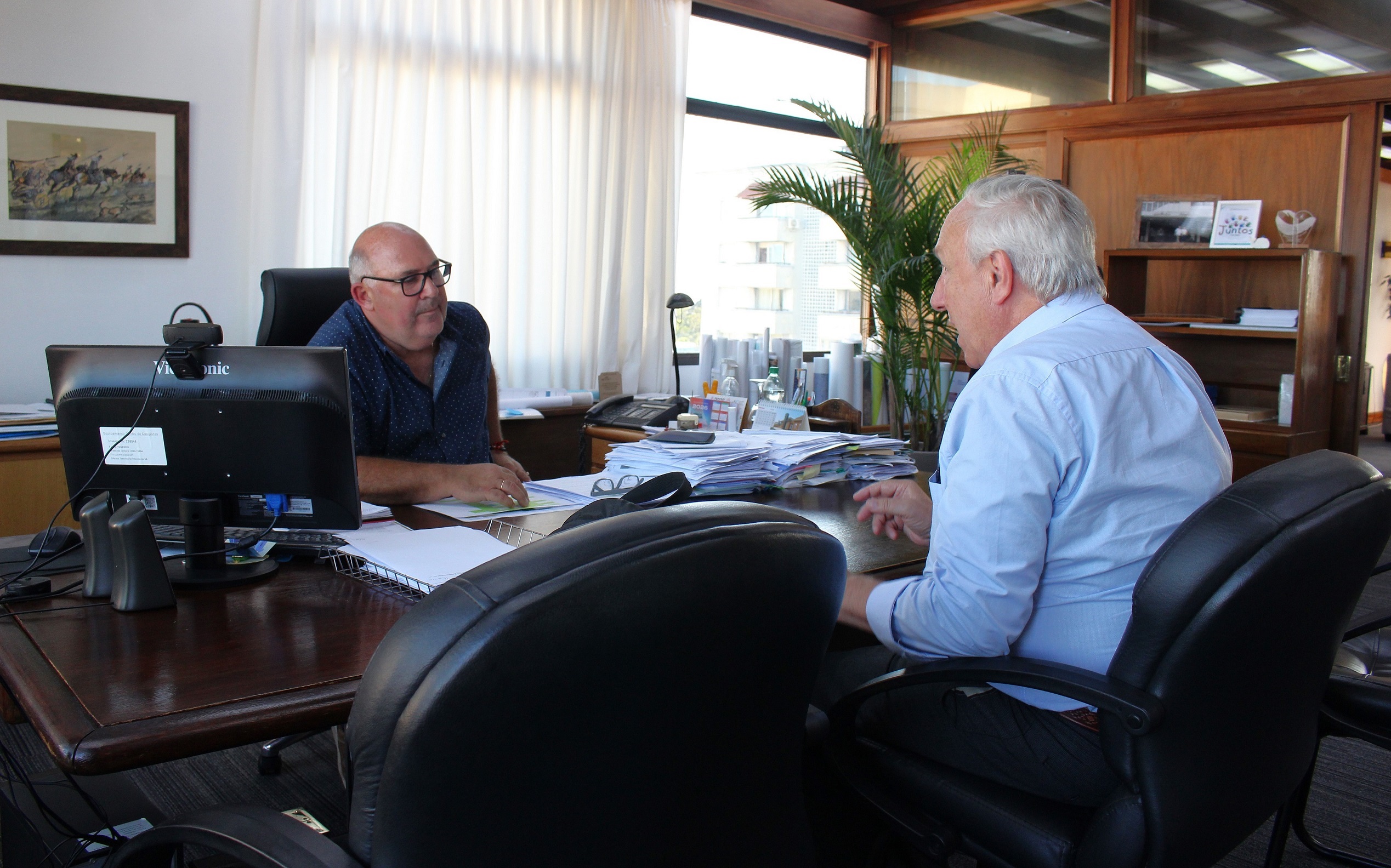 El intendente Miguel Abella, recibió en su despacho este viernes 6 de febrero, al presidente de la ANP Constante Mendiondo, ocasión en la que dialogaron sobre distintos temas y puntualmente de mejoras que se planifican para el puerto de Piriápolis, en procura de “poner en valor esa área deprimida” señaló este último.