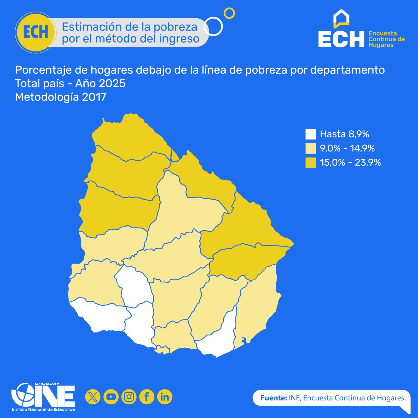 La pobreza en Uruguay en 2025 se ubicó en el 16,6% de la población, bajando 7 décimas con respecto a 2024, según datos que publicó el Instituto Nacional de Estadística. En el caso de los hogares, la proporción bajo la línea de pobreza se ubicó en 13,2%.