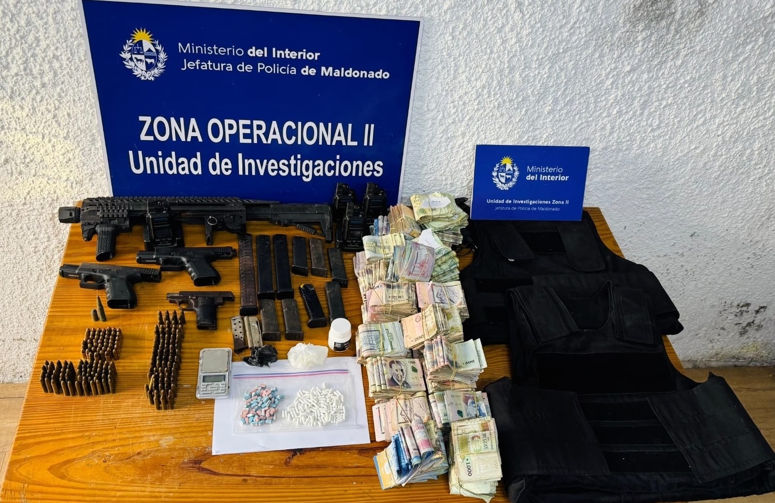 Allí se incautaron dos pistolas marca Glock (una con numeración y selector de disparos adulterados, y otra hurtada en 2017 en Canelones), una pistola marca Liberty calibre 22, dos chalecos antibala, y un accesorio para arma de fuego; un peine de 40 proyectiles y dos de 30; 7 cargadores calibre 9m.m. y 2 calibre 22m.m., 143 balas calibre 30, 45 calibre 9m.m., una calibre 44 y otra calibre 50.