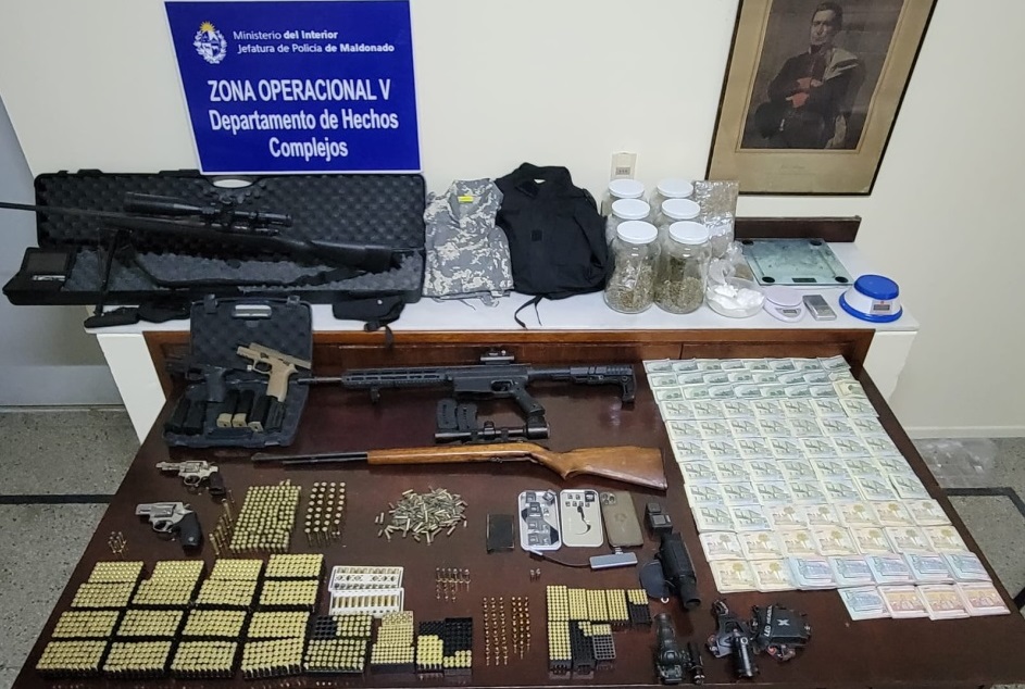 También se incautaron $ 561.955 y US$ 2.436, y prendas tácticas, linternas, una cámara GoPro, un puntero láser, y 4 balanzas digitales, así como otra serie de efectos considerados de interés para la investigación. Por el volumen de lo incautado se debió solicitar apoyo a la Intendencia de Maldonado para el traslado.