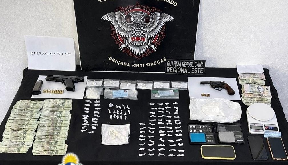 Por otra parte, se incautaron 250 gramos de clorhidrato cocaína, varias dosis prontas para ser vendidas de la misma droga, y otras 100 dosis (envueltas en papel), marihuana y tres balanzas digitales; también un revólver marca Rossi calibre 22, una pistola HK (del Ministerio del Interior hurtada en 2019), y balas calibre 22 y 9m.m.