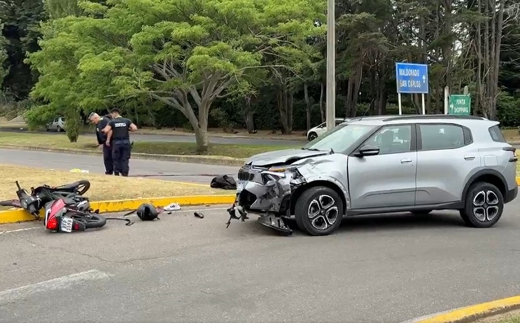 Ocurrió sobre la hora 17.00 de este jueves 20 de noviembre, en un punto que a esa hora registraba un importante movimiento, hacia y desde Punta del Este, y conduce a importantes centros comerciales de la zona. Un automóvil conducido por un brasileño, impactó contra una moto ocupada por dos hombres.